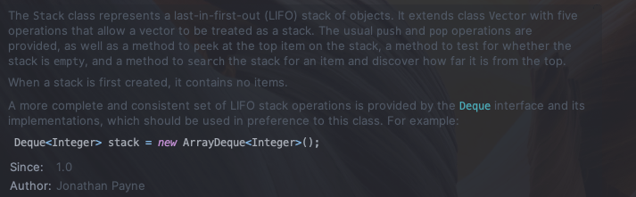 하지만 Stack 구현 클래스의 설명에는 Stack 대신 ArrayDeque 사용을 권장하는 것을 볼 수 있습니다.