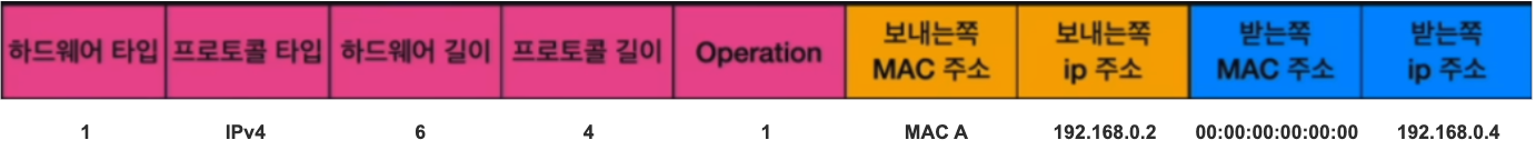 이제 ARP 프로토콜을 이용해야 하는데, 그 전에 ARP Packet 구조를 한번 살펴볼게요.