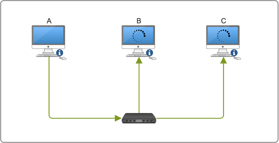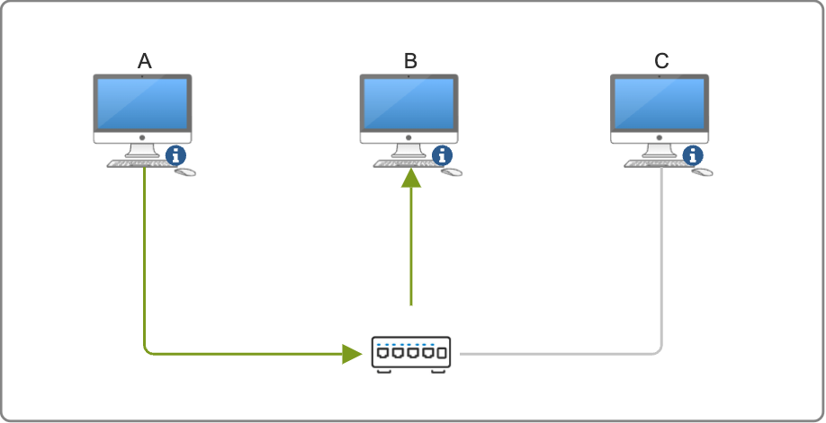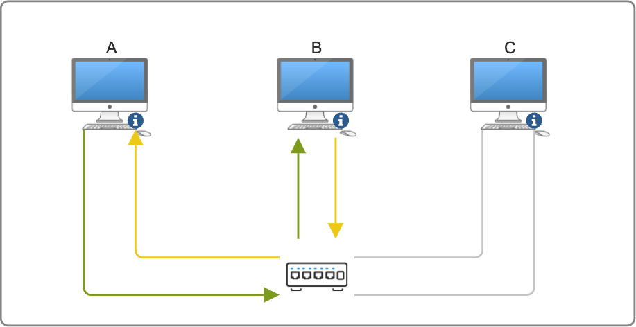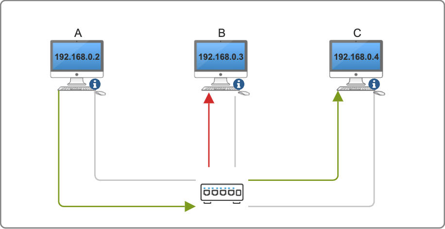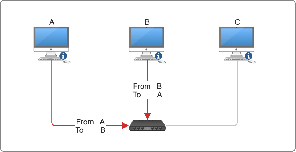 A에서 보낸 데이터가 스위치로 오게되면, 스위치는 해당 데이터의 목적지 MAC Address를 보고 자신의 테이블에서 주소를 찾아 매핑되어 있는 스위치 포트로 데이터를 전송하게 돼요. 따라서, A는 B에게만 데이터를 보내게되고, C는 불필요한 데이터를 받지 않게 되었어요.