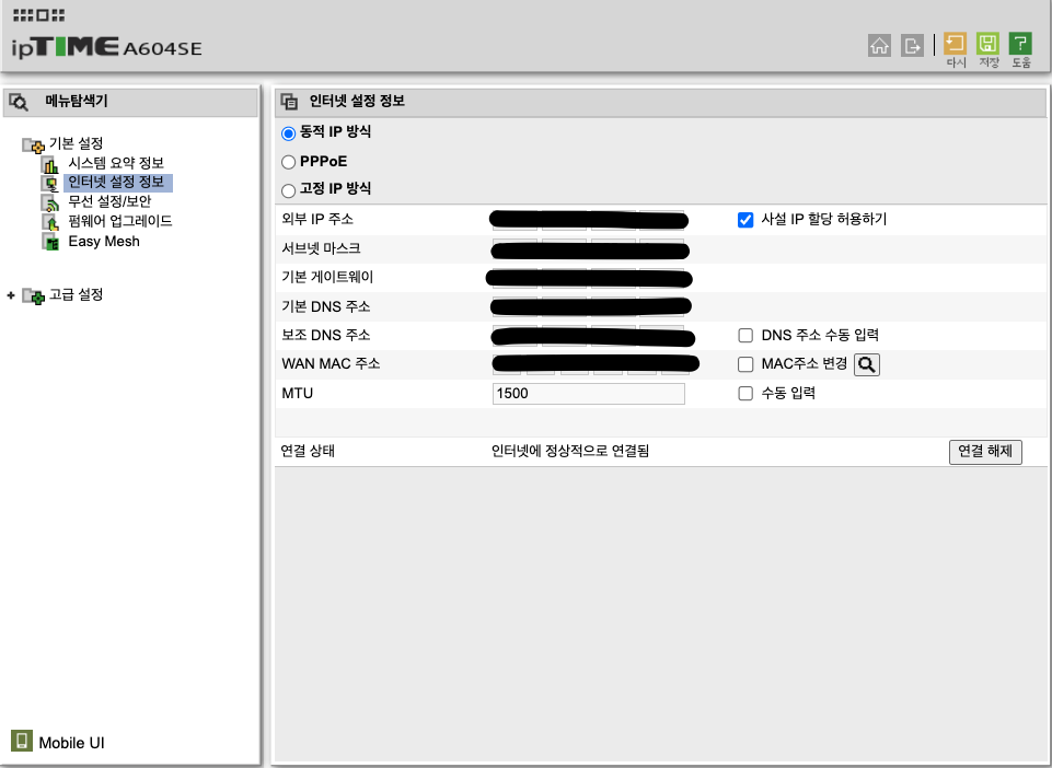iptime 공유기를 쓰고 계신다면 192.168.0.1 주소로 접속하여 로그인 하신 후 인터넷 설정 정보란에서 간단하게 MAC Address를 바꿔볼 수 있어요.