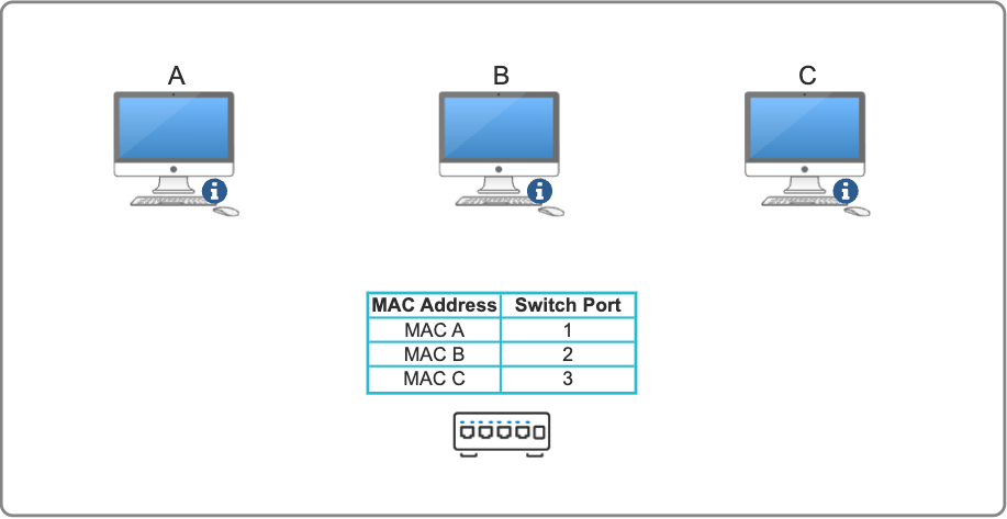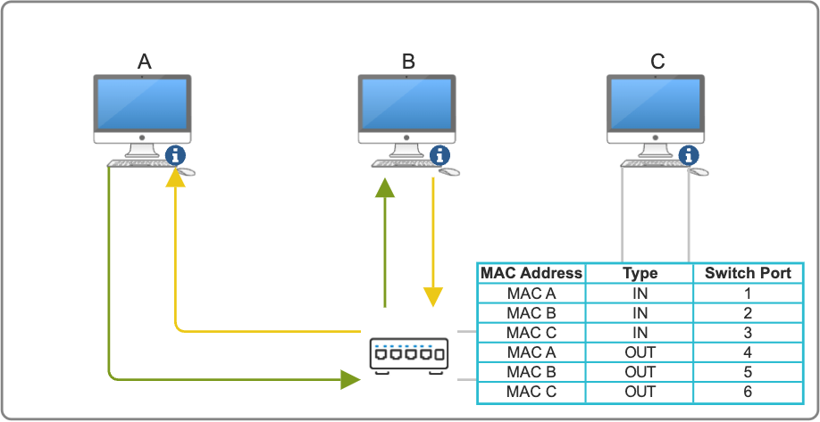 디바이스 A는 이제 디바이스 C에 대한 MAC Address를 기억할 것이고, 이제 디바이스 C에게 데이터를 전송할 수 있어요!