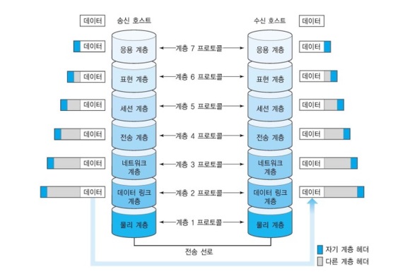 위의 그림은 디바이스 간의 데이터 통신 과정을 단계에 따라 나눈 것으로 OSI 7계층 이라고 불러요.
