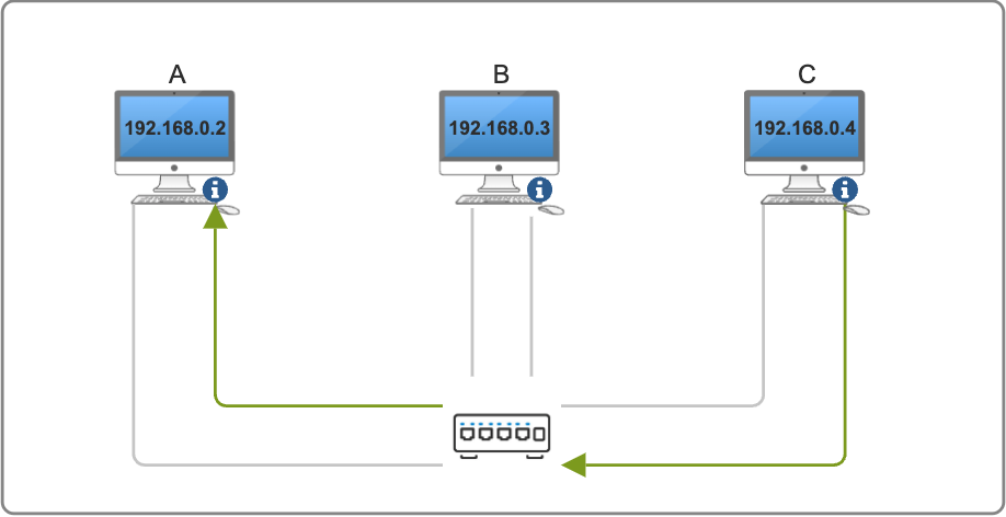 예를 들어, A, B, C 디바이스가 있다고 가정할 때, A 디바이스가 C 디바이스의 MAC Address를 알고있다고 가정해볼게요.