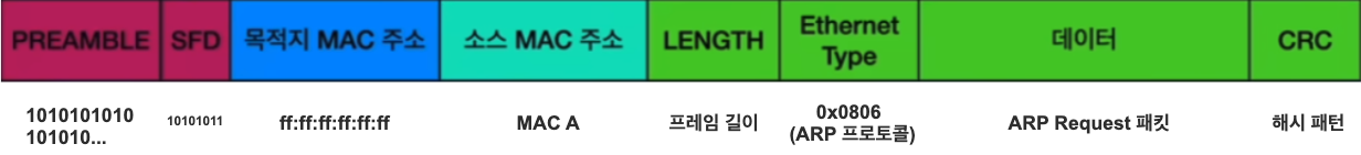 ARP Packet은 3계층 - 네트워크 계층과 2계층 - 데이터링크 계층 중간에 위치하기 때문에 Frame으로 감싸는 작업이 필요해요. 다음과 같이 Frame을 만들 수 있겠네요.