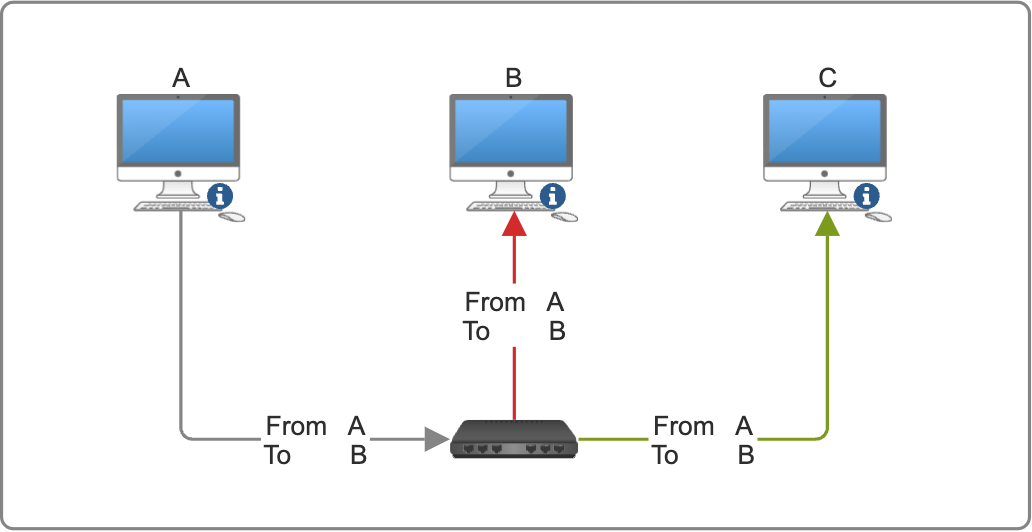 따라서, 다음과 같이 데이터를 보내게 된다면, B는 자신에게 보낸 데이터가 아니기 때문에 버리게 되겠죠?