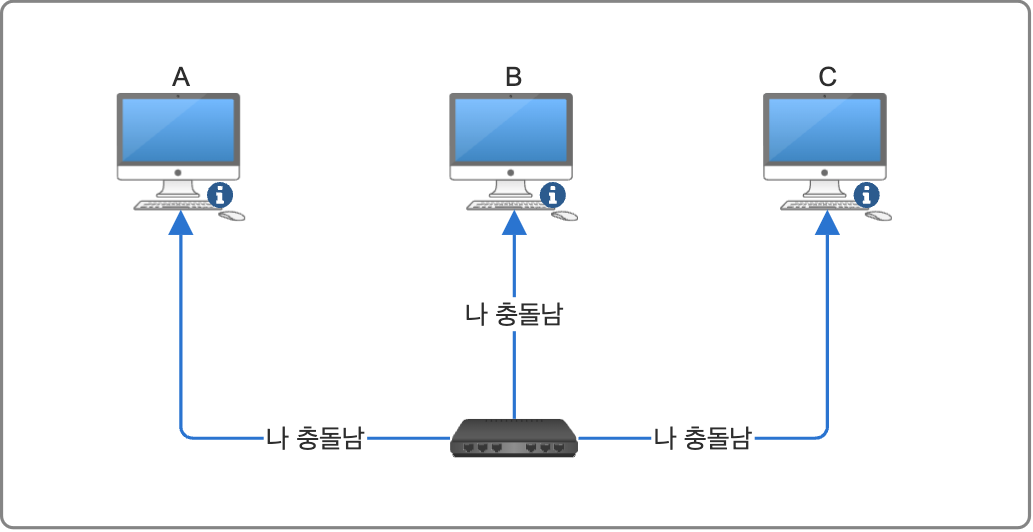 허브는 이러한 상황에서 어떻게 대처할까요? 허브는 충돌이 발생했다는 것을 인지하고 해당 데이터들을 폐기해버려요.